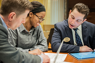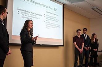 Scholars work in teams (lead by senior-level students) to analyze and present a solution to a specific business challenge to a panel of faculty and business professional judges. Prizes are awarded to the winning team. Previous prizes have included tuition credit, iPads and Microsoft Surfaces).
