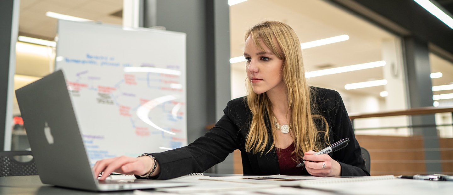 A woman seated at a desk with an open laptop in front of her and a white board with a chart behind her.