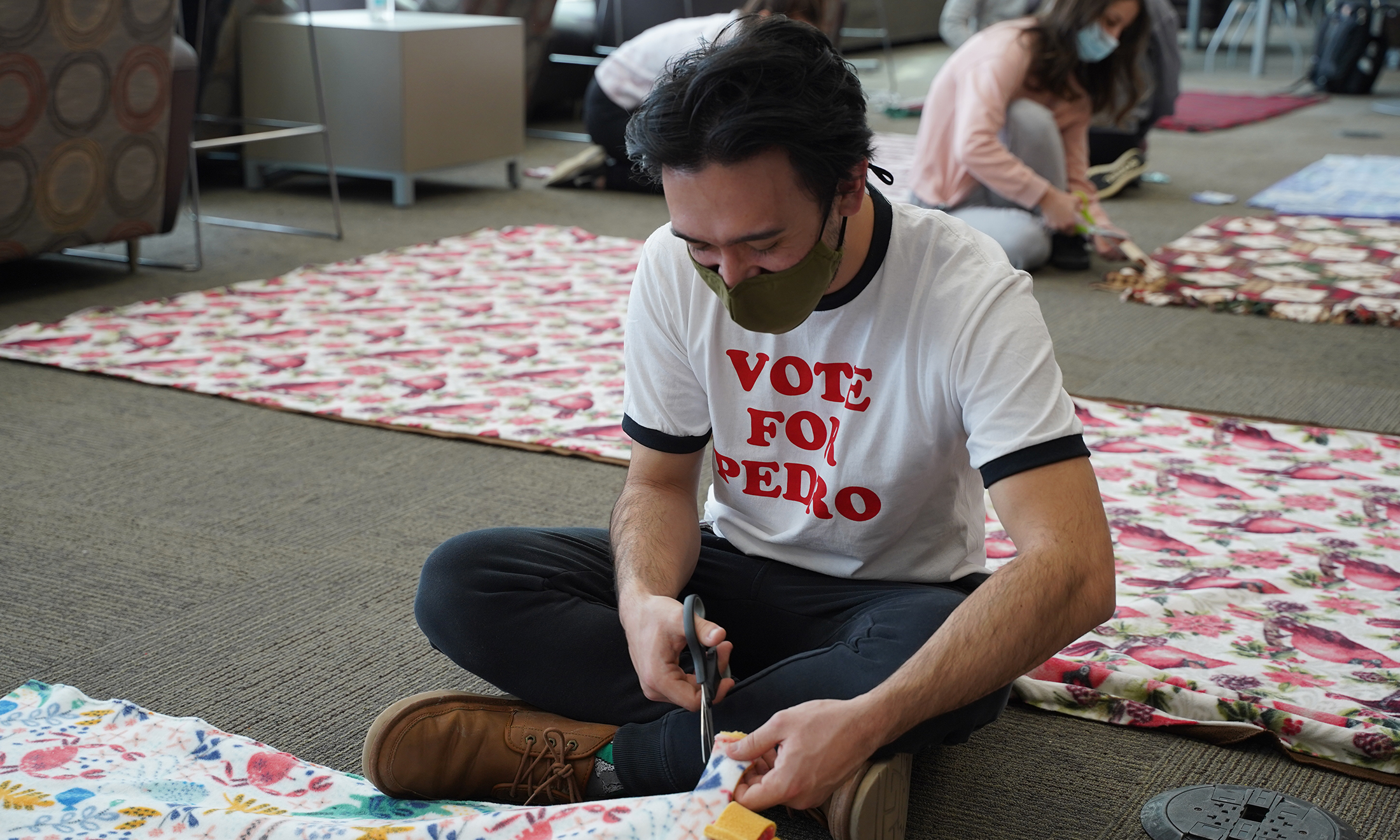 Together, they created 15 tie blankets, which are made by tying two big pieces of fleece together. Materials were donated and/or purchased by the two student organizations.