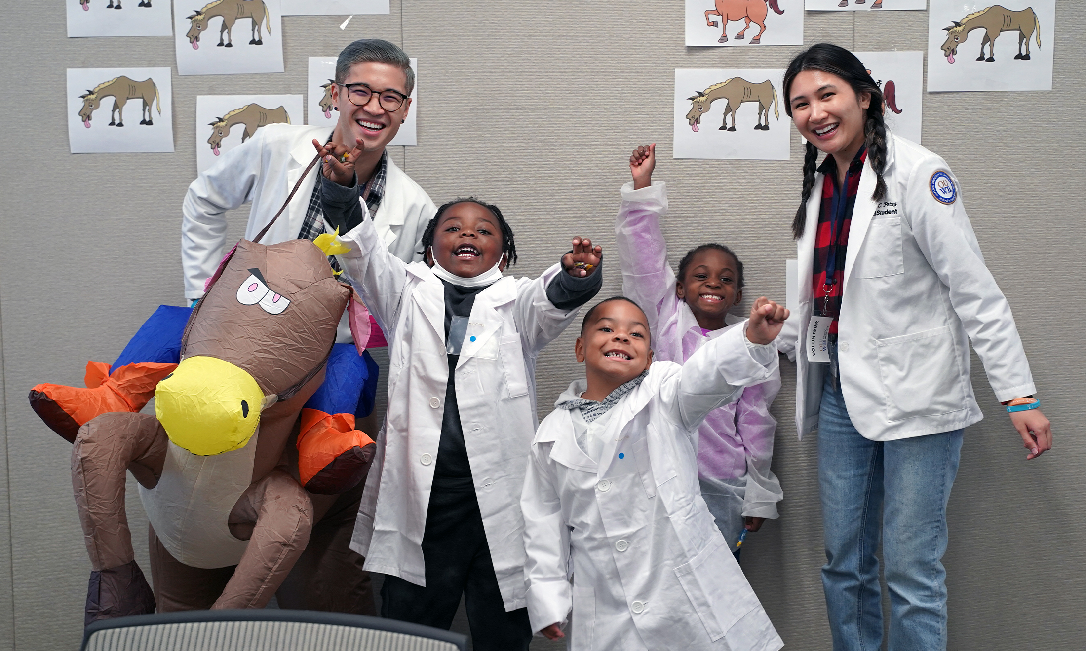 For the inaugural version held at OUWB, several stations were set up in O’Dowd Hall. Medical students ran the various sessions. In one room, students learned about mucus and germs by making slime. In another room, students learned about herd immunity through a visual analogy of a herd of horses with the assistance of their instructor, Kevin Van, who donned an inflatable horse costume to drive the point home.