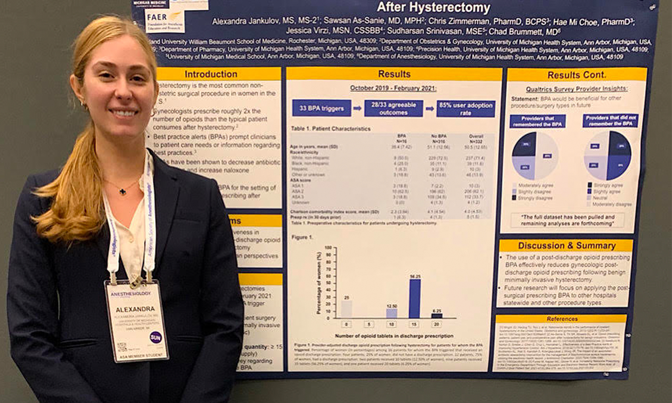 The project she led was called “Effect of Best Practice Alert (BPA) on Post-Discharge Opioid Prescribing After Hysterectomy.” The project studied post-discharge opioid prescribing for hysterectomies, which led to development of a novel BPA.