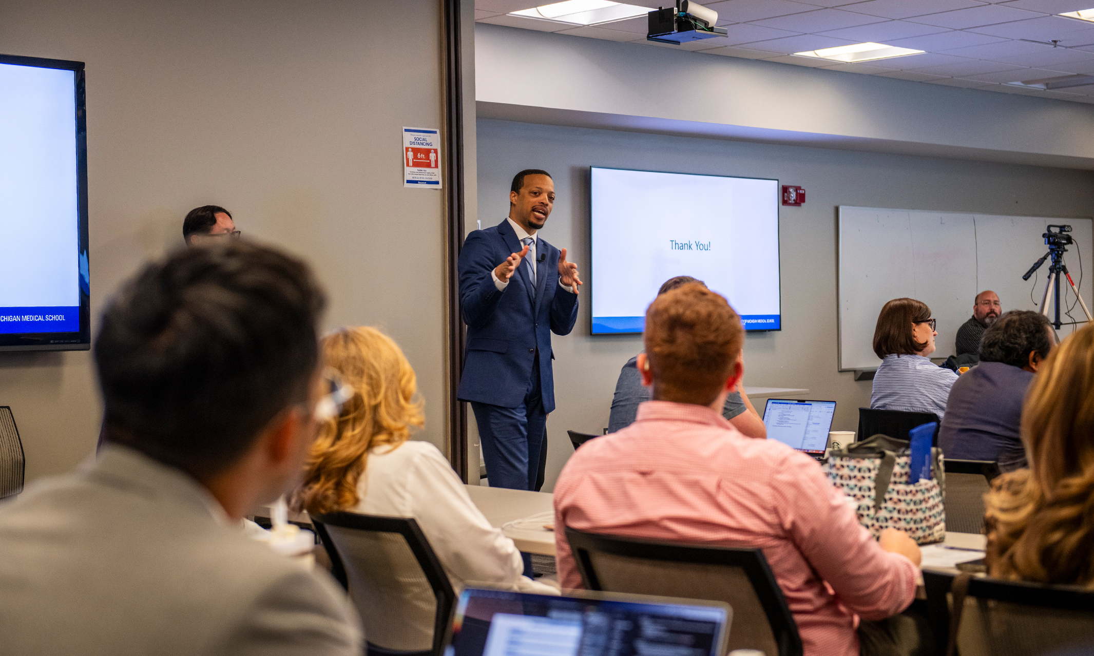 He used the metaphor of three speeding trains to represent AI in medical education. One represented the use of AI in teaching and learning purposes, another teaches learners to engage with those technologies, and a third uses AI for med ed scholarship.