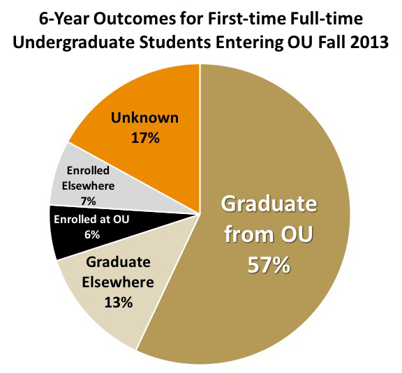 While many students who enroll at OU complete their degrees at OU, some students successfully complete their degrees at other institutions. In addition to the 57 percent of first-time undergraduates entering OU during Fall 2013 who graduated from OU within six years, 13 percent received degrees from other institutions. Another 13 percent of these students remain enrolled at either OU (6 percent) or other institutions (7 percent).