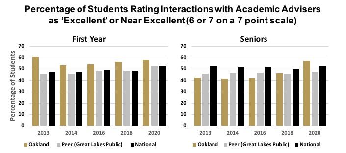 The National Survey of Student Engagement (NSSE) asks first-year students and seniors a series of questions about their educational experiences while in college. The charts above show how Oakland University students rate the quality of their interactions with academic advisers.