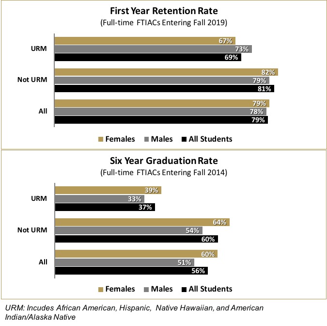 Students from underrepresented minority (URM) groups have lower first year retention rates and six-year graduation rates than students who are not from minority groups.