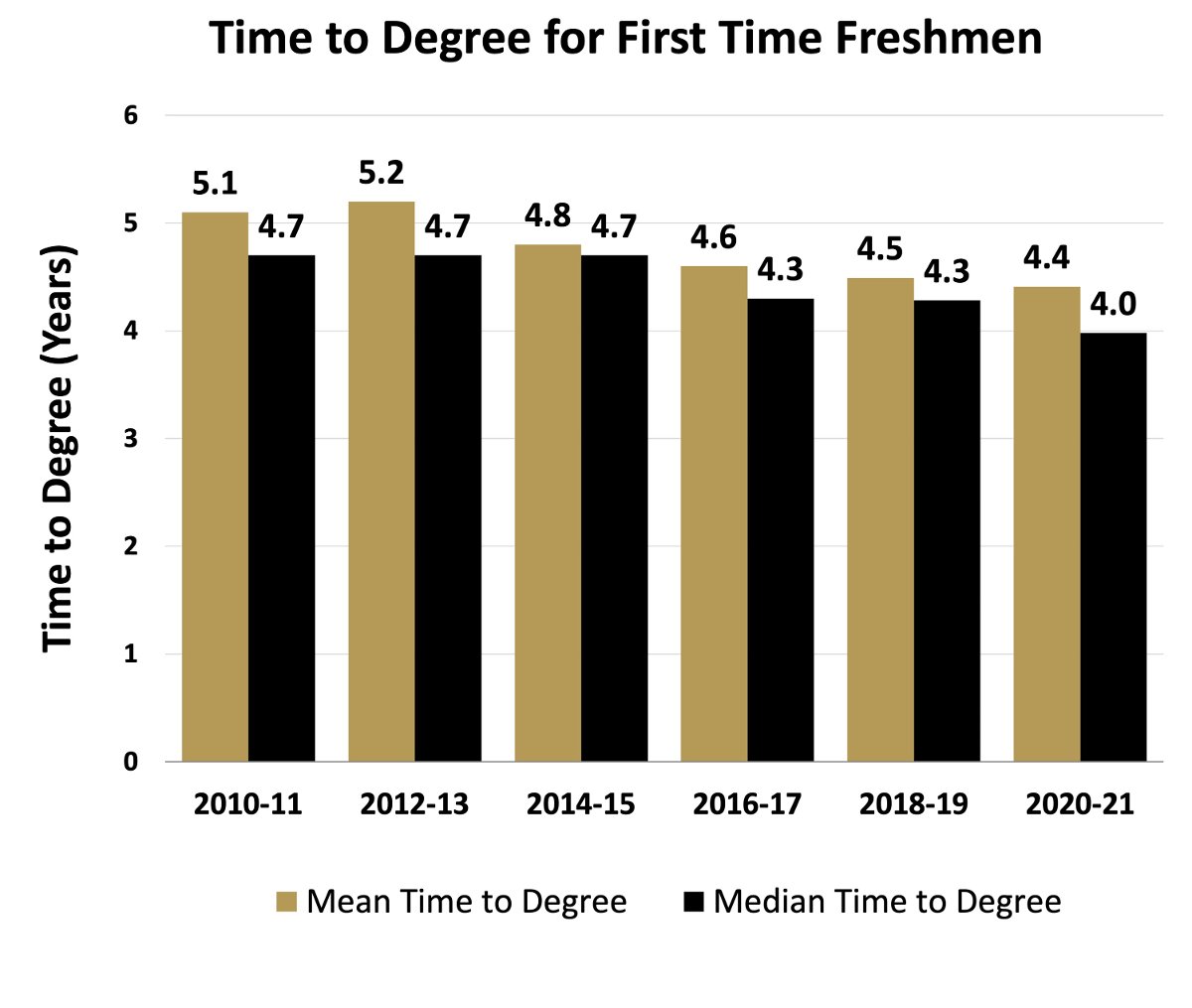 The typical time it takes first time Oakland University freshmen to earn their undergraduate degree has declined in recent years. Among students who graduated during the 2020-21 academic year, the mean number of years was 4.4 and the median number of years was 4.0. Both of these figures represent either modern records or ties with modern records based on available historical data.