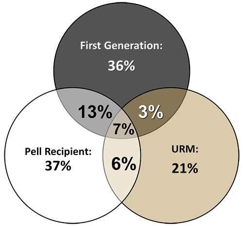 Many incoming freshmen are from groups that have traditionally experienced challenges with engagement and persistence. More than half of new freshmen entering OU during Fall 2020 were either first generation college students, federal Pell grant recipients, or from an underrepresented minority. A large percentage are from more than one group.