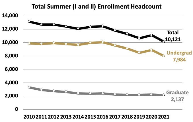 The official 2021 Summer I and Summer II enrollment count is 10,121 students. This total for summer 2021 is less than the same figure for summer 2020. Total headcount decreased by 8.7 percent, with undergraduate headcount decreasing by 10 percent and graduate headcount by 3 percent.