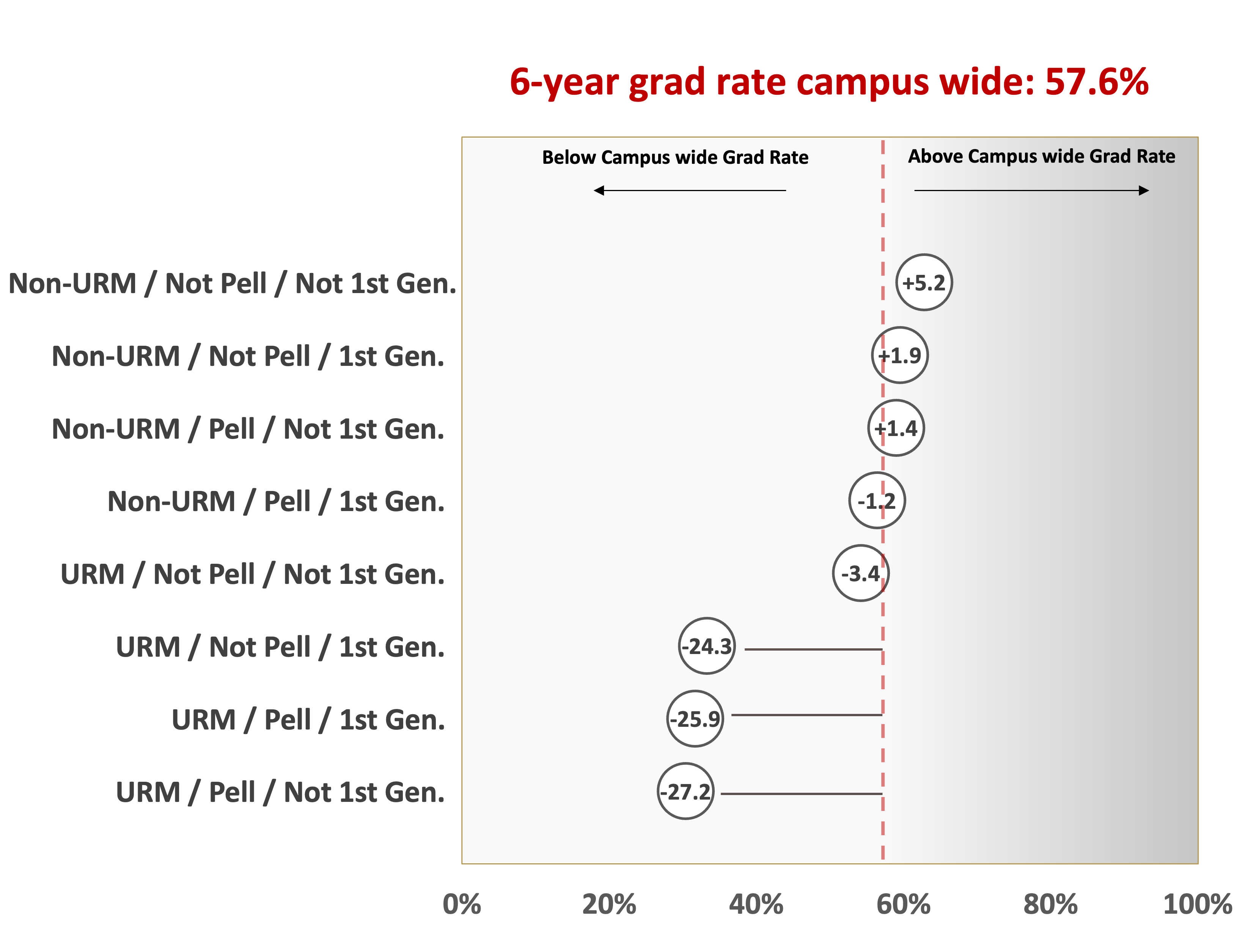 The six-year graduation rate for all full-time first year students who started OU in 2016 was 57.6%. However, the outcomes for students vary by racial/ethnic background, economic status, and family educational background. The chart shows the six-year graduation rate gap for groups of students relative to the campus-wide rate. The Student Success and Equity Dashboard features interactive data tools to explore OU’s equity gaps and to understand how these gaps impact the success of our students.