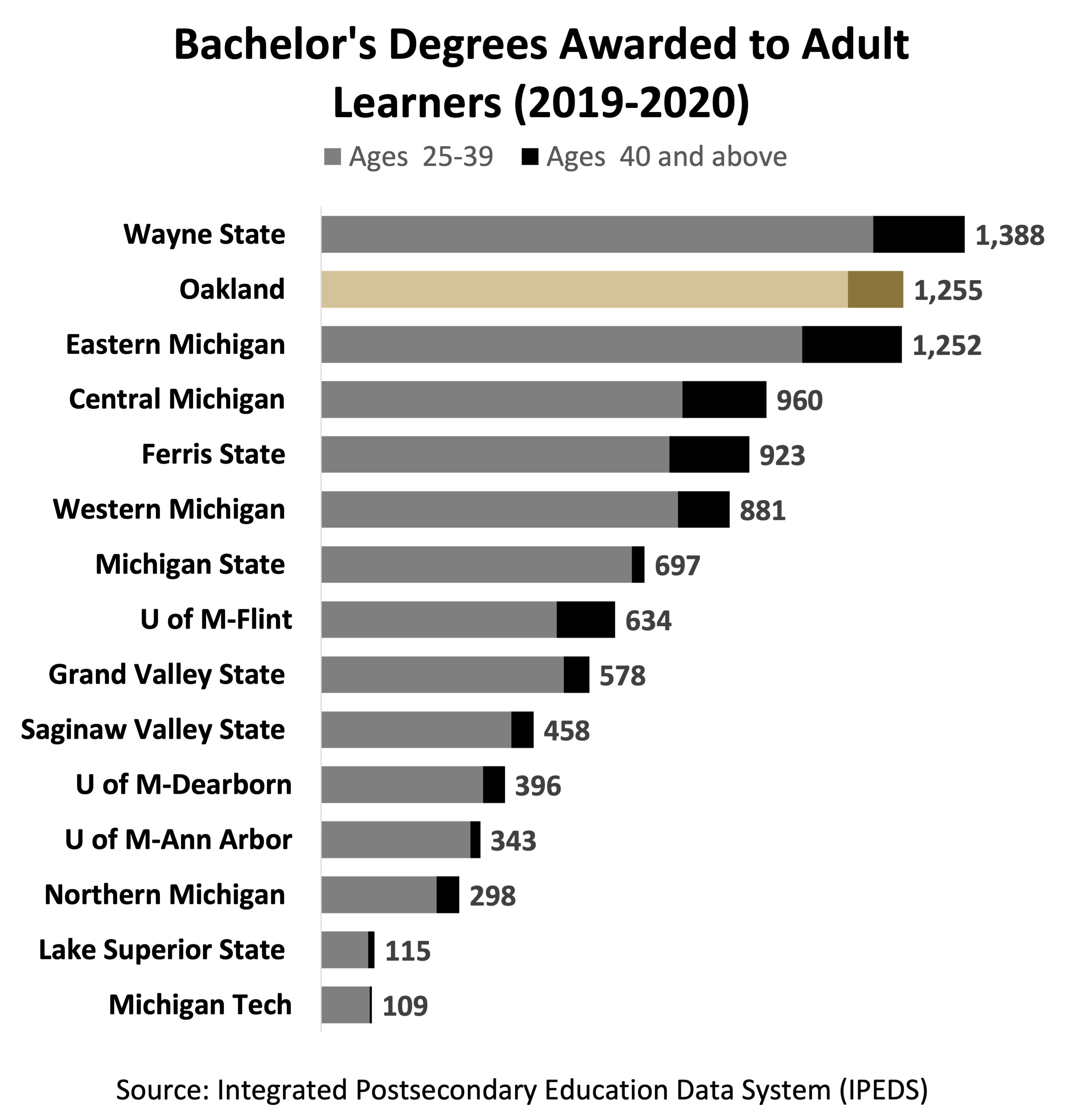 Oakland University ranks second among Michigan Public Universities in the number of bachelor’s degrees awarded to adult learners, which are defined as students aged 25 years and older.