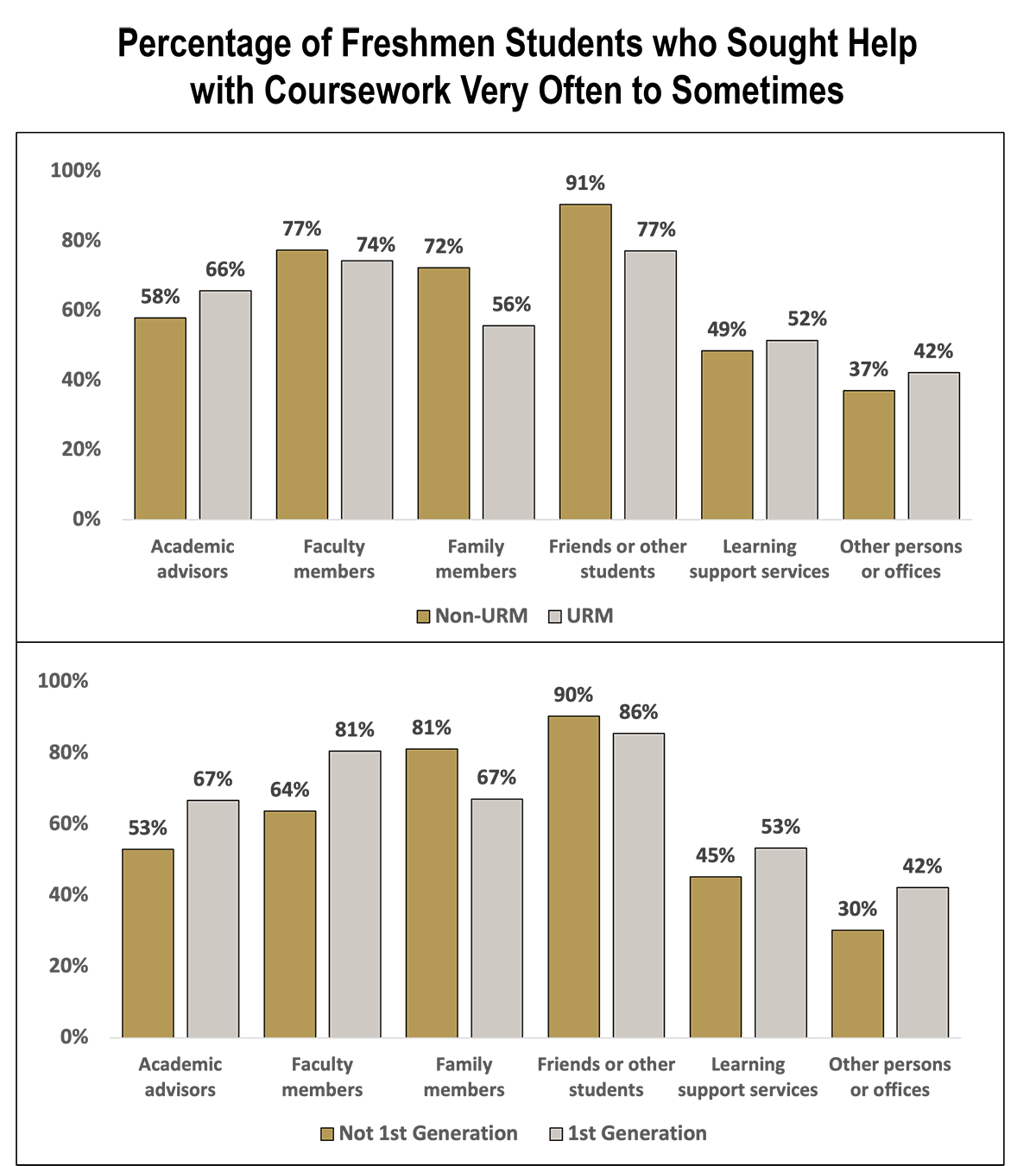 According to the 2022 National Survey of Student Engagement (NSSE), under-represented minority (URM) freshmen at OU sought help from academic advising and learning support services more often than non-URM freshmen. Non-URM students were more likely to get help from friends or other students. First-generation freshmen students sought more help than their counterparts and were more likely to seek help from faculty.