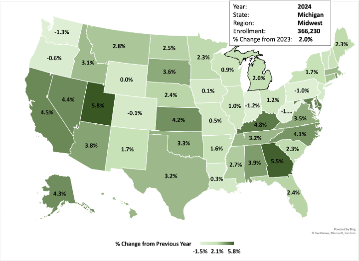 Nearly all states are seeing growth or a slowdown in declines this past year, after several years of decreased enrollment. Undergraduate enrollment in Michigan increased by 2.0% over last winter.