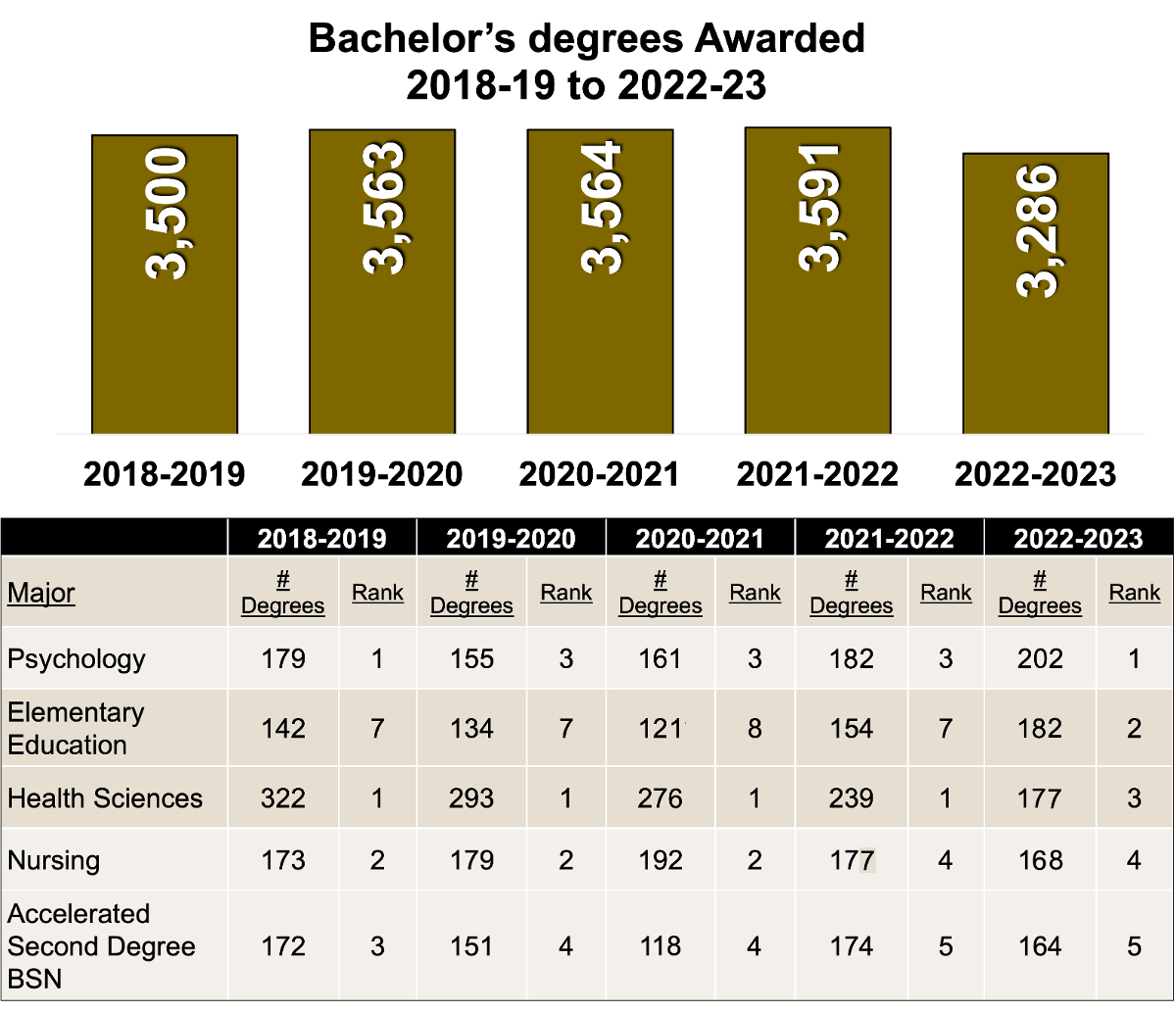 Oakland University awarded 3,286 Bachelor’s degrees in 2022-23. The top three degrees awarded were in psychology, elementary education and nursing. Over the past five years, the highest number of bachelor's degrees have been awarded in health sciences, psychology and nursing. For more information about degrees awarded, visit the OIRADA Degrees Awarded Dashboard.