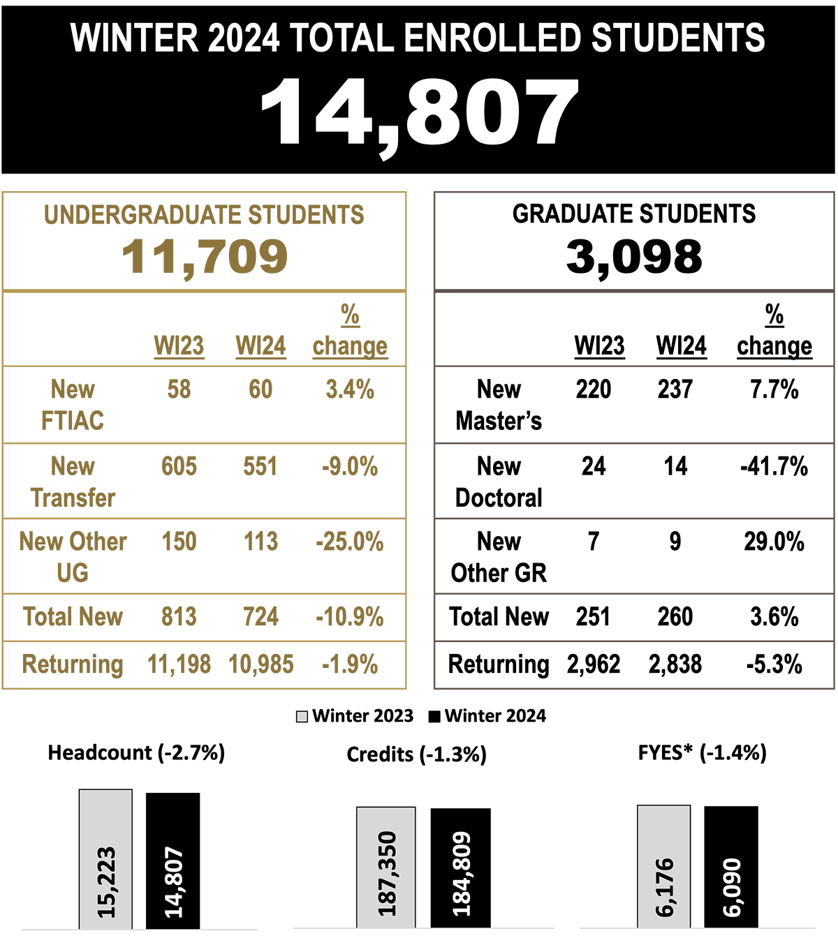 New undergraduate student enrollment fell 11 percent below Winter 2023 totals at the same time that new graduate student enrollment rose 3.6 percent