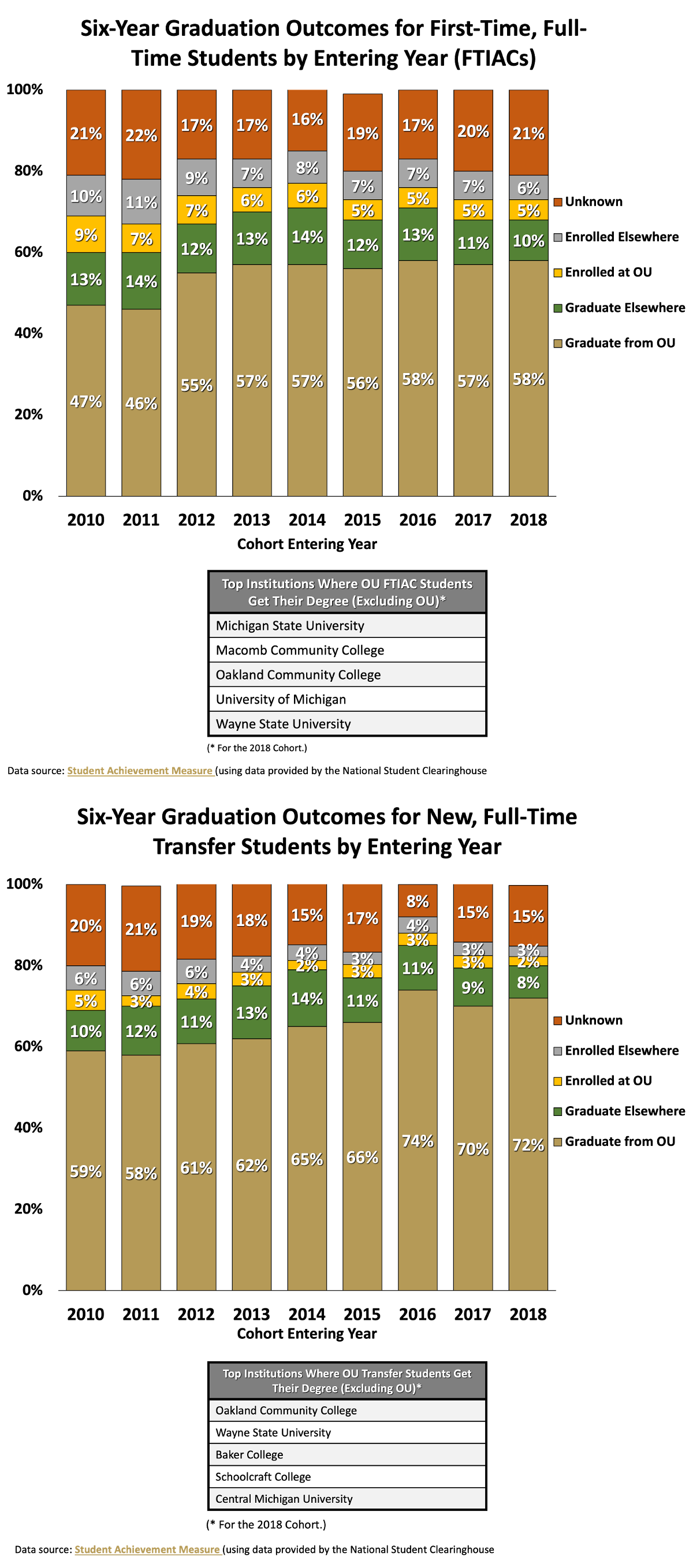 About 70% of OU FTIACs graduate within six years. Of those, close to 60% get their degree from OU and another 10% get their degree from another institution. The charts above display graduation outcomes for OU first-time, full-time (FTIACs) and transfer students. For more information regarding OU’s graduation outcomes, visit the OIRADA Student Achievement Measure Dashboard. For general information, contact [email protected].
