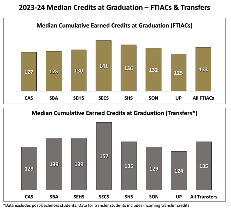 The median number of earned credits for all undergraduate students who graduated during 2023-24 was 134. About half of OU graduates would have graduated with more than 134 credits, half with fewer.