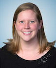 Headshot: Blonde woman with glasses in black top smiling at camera