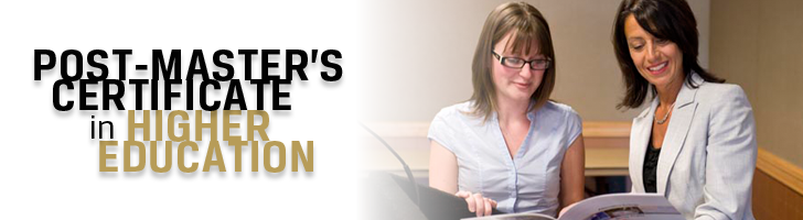 The Post Master's Certificate in Higher Education offers a flexible opportunity to learn more about higher education for practitioners in the field and explore possible career options for those not already working in higher education. It is designed for working professionals. Courses are offered in the evenings and may be taken in any sequence to offer you maximum flexibility. Typically, students take one course per term and complete the program in four semesters. However, if your schedule permits, students may take two courses and complete in one academic year.