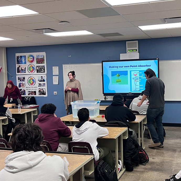 | The MECC team built a homemade point absorber – a device that moves up and down in waves; the more waves, the more energy is produced – and present it at Melvindale High School. |