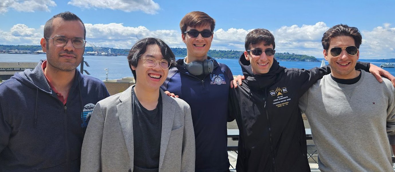 | 2024 team at the MECC conference in Portland, OR. Left to right: Saber Khanmohammadi, mechanical engineering Ph.D. student; Mike Zheng, mechanical engineering major; Gerard Griest, electrical and computer engineering major; Lance Markowitz, dual degree in Spanish language and literature and general management; Matt Bruar, bioengineering major. |