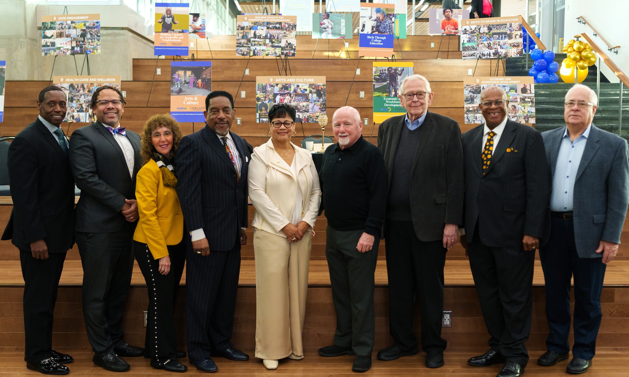 Leaders of the OU-Pontiac Initiative include, from left: Glenn McIntosh, Khalfani Stephens, President Ora Hirsch Pescovitz, Tom Kimble, Teresa Rodges, Kevin Corcoran, Bob Maxfield, Pastor Douglas Jones, Doug Smith.