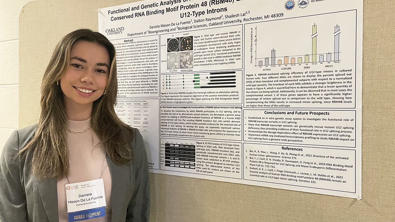 Oakland University student Daniela Meson De La Fuente recently presented research at the 2024 Maize Genetics Meeting, an international conference that brought together researchers whose work advances the field of maize (corn) genetics and breeding.
