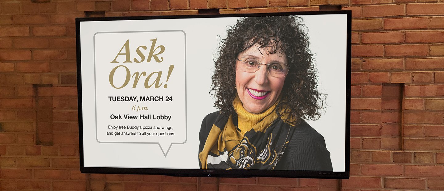 UCM provides design services so that your messaging on these displays will match and support other materials used for the campaign or event. Contact your account manager for more information. Various departments manage playlists for their respective displays, but UCM can also manage uploading these images for you.
